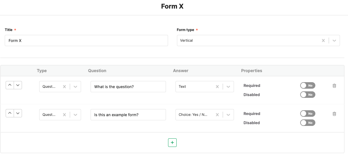 Click the green plus icon to create a new form. The title and form type are mandatory fields.
