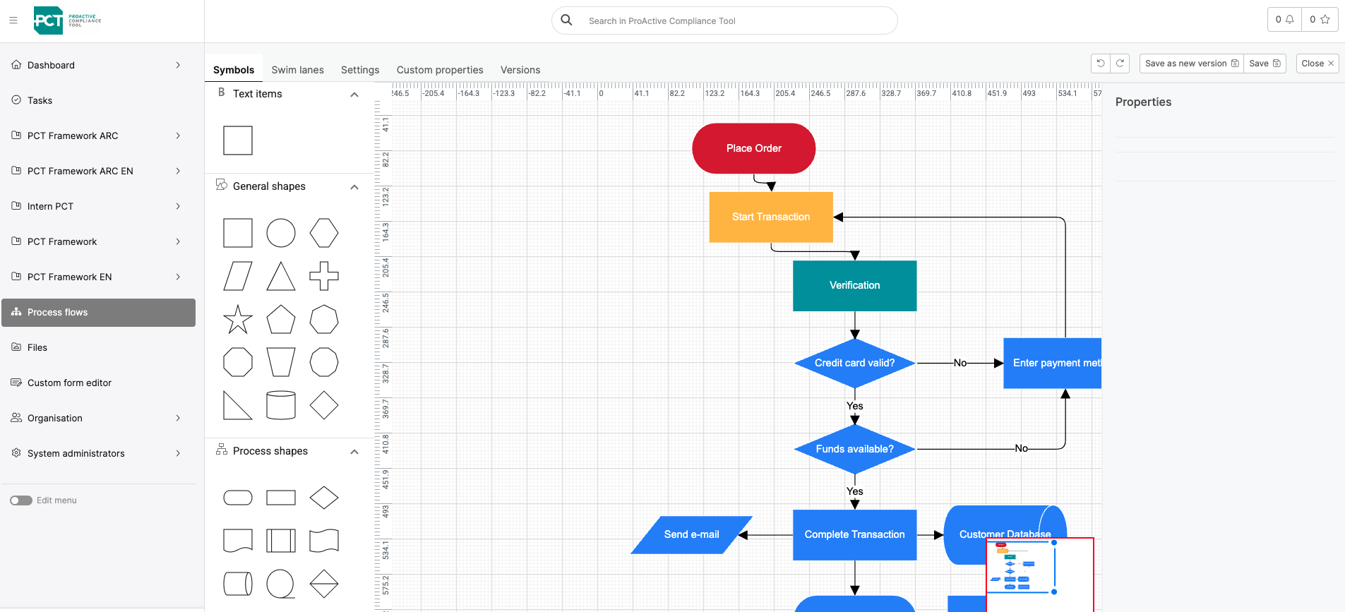 When you open the Process Flows section, all created process flows are shown. You can use the pencil icon or the 3 dots on the right (edit) to make a change to the existing process flow. When you make a change, you can click ‘Save as new version’.