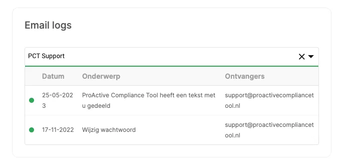 Een beheerder kan inzien of e-mails juist verstuurd zijn. Klik in de omgeving op Organisatie. Onder aan de pagina vind je ‘e-mail logs’. Selecteer hier de betreffende gebruiker. Vervolgens wordt getoond welke e-mails er verstuurd zijn en wat de status van de e-mail is. Wordt er een groen bolletje getoond, dan is de e-mail afgeleverd bij de ontvanger.