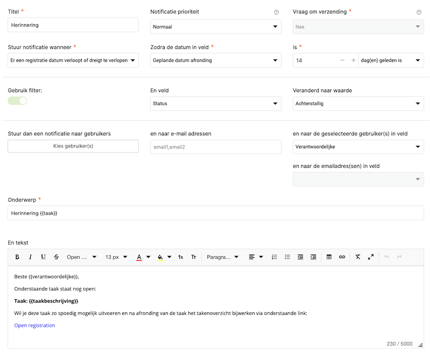 Wanneer je herinneringen wilt instellen om gebruikers te herinneren om een taak uit te voeren dan kun je dit als volgt instellen: In het voorbeeld wordt de herinnering na 14 dagen gestuurd, maar dat is door jullie als organisatie instelbaar.